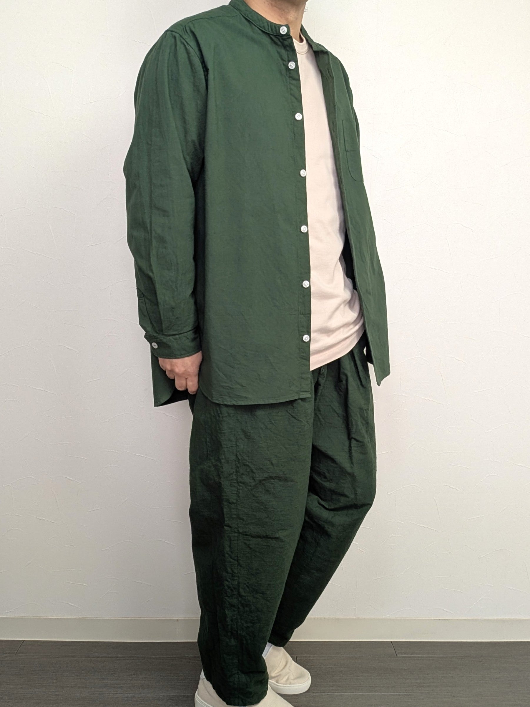 リラックスシルエット、細身のバンドカラーや前立て、小さ目のポケットなどユニセックスで使えることを意識して設計されたシャツです。今回から少しサイズをリニューアルし、従来のLサイズをXLとして、新しくLサイズを設計しなおしました。