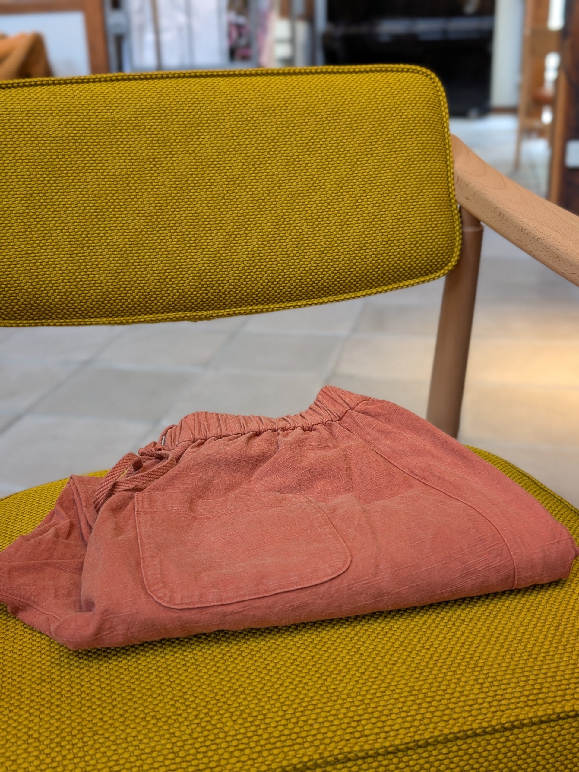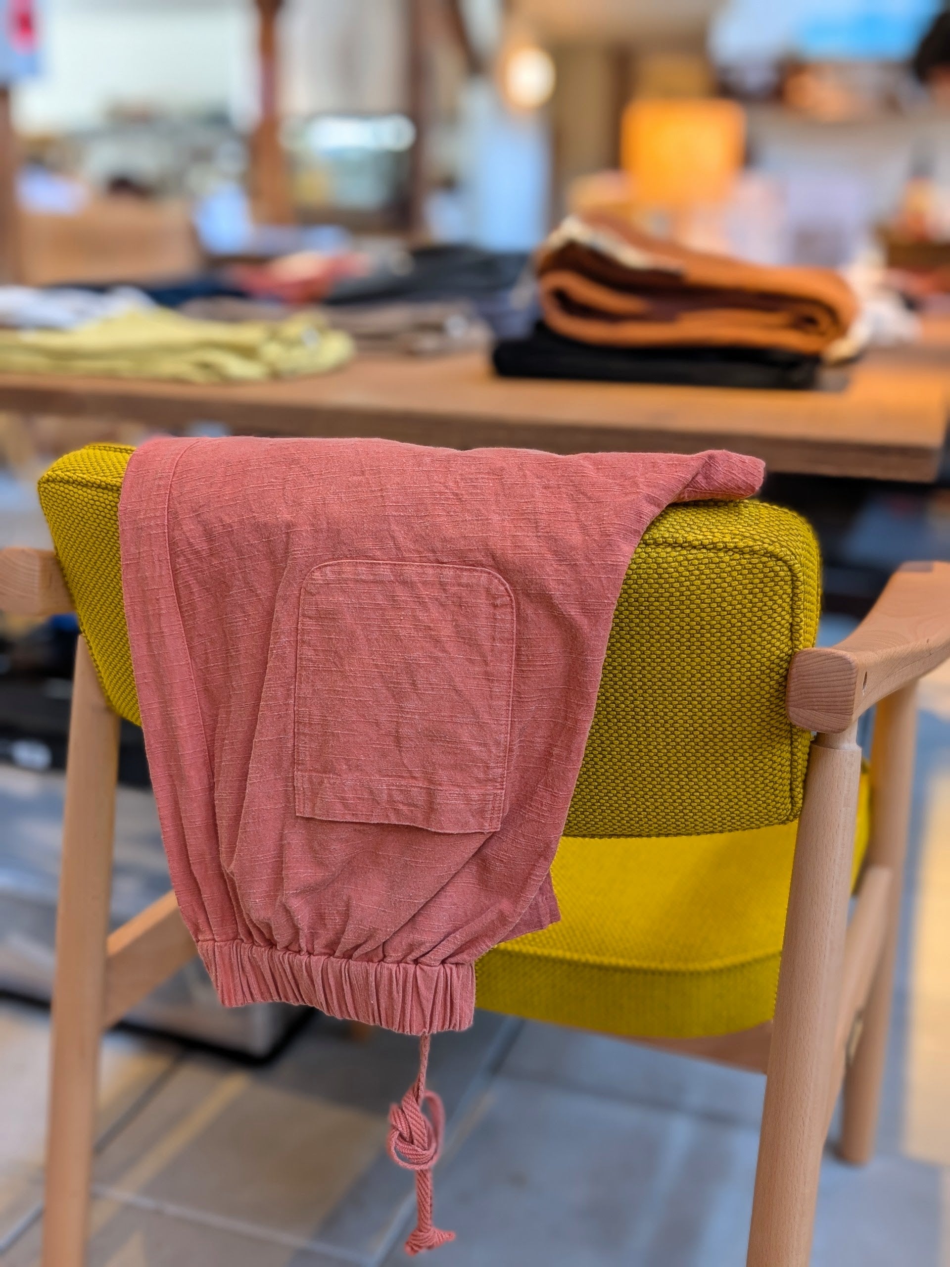 形はバルーンパンツ型でもも周りやヒップ、ウエストをゆったりとり、裾に向けて細くなるシルエット。ウエストを伸縮性の高いゴムにしてサイズフリー、ジェンダーフリーのアイテムを目指しました。折り返しても表裏同色で目立ちません。