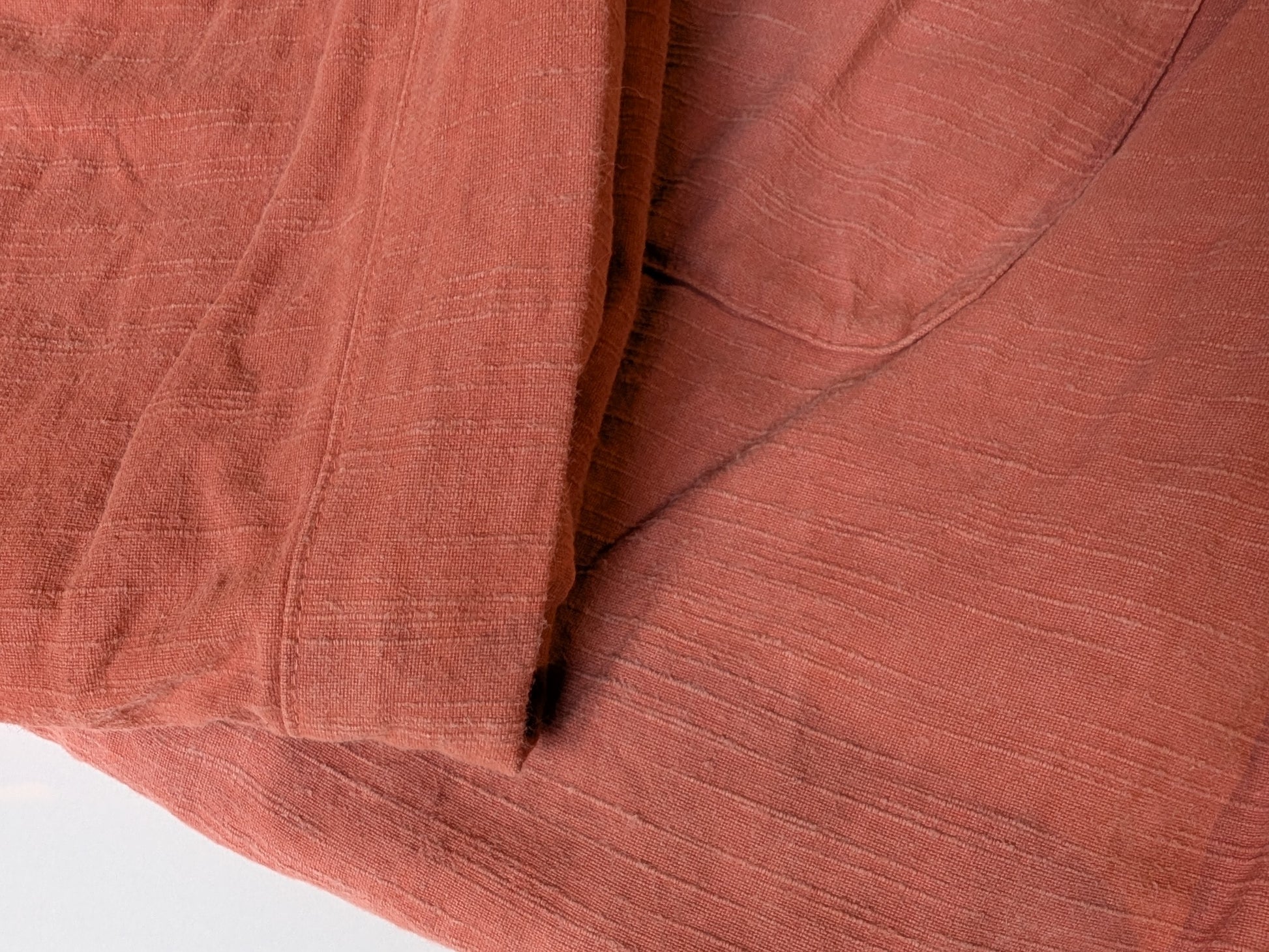 使用している生地は知多木綿生地の一つで少し硬めの彩紬。スラブ糸という節のある糸を使うことで出る、凹凸のある表面が特長的な素材です。