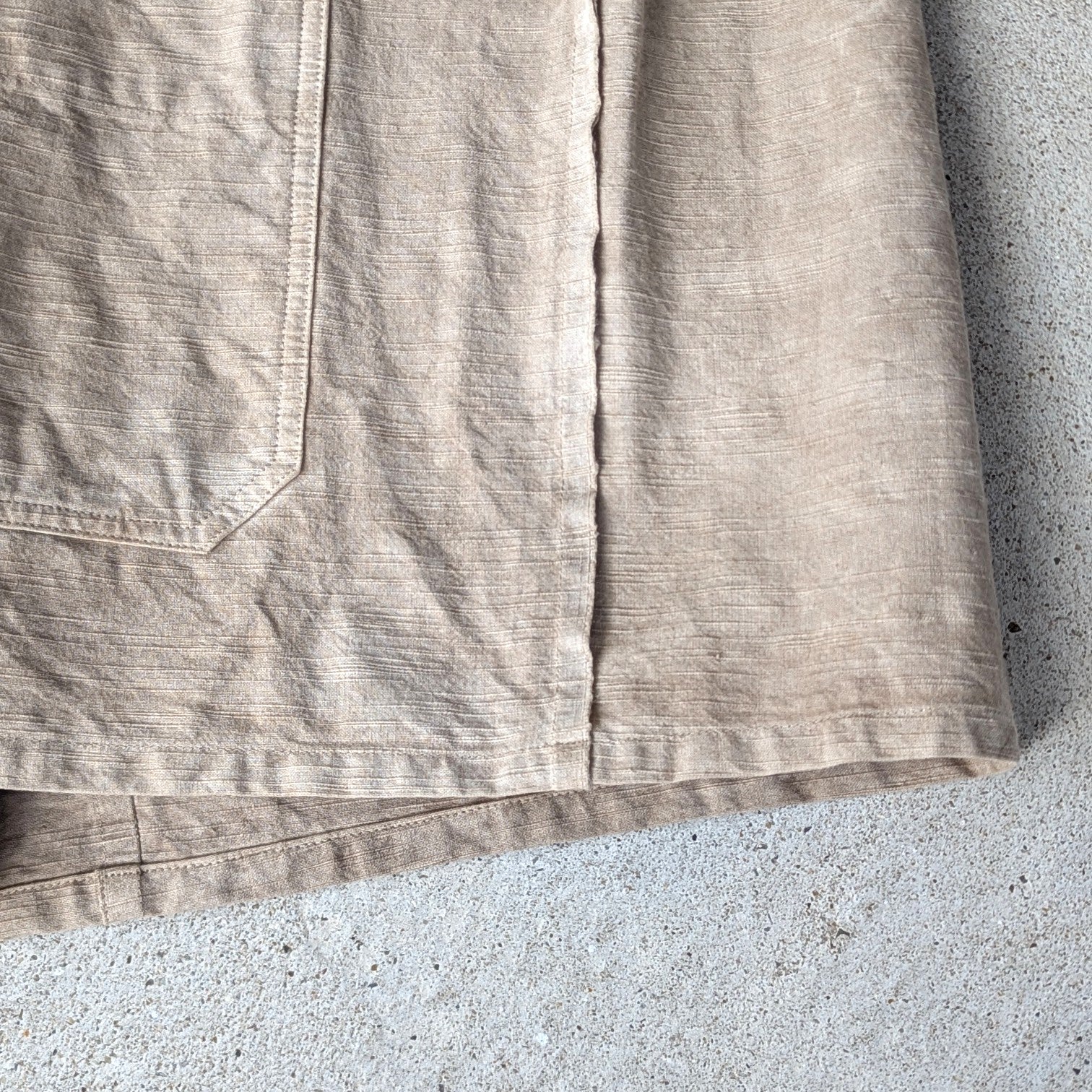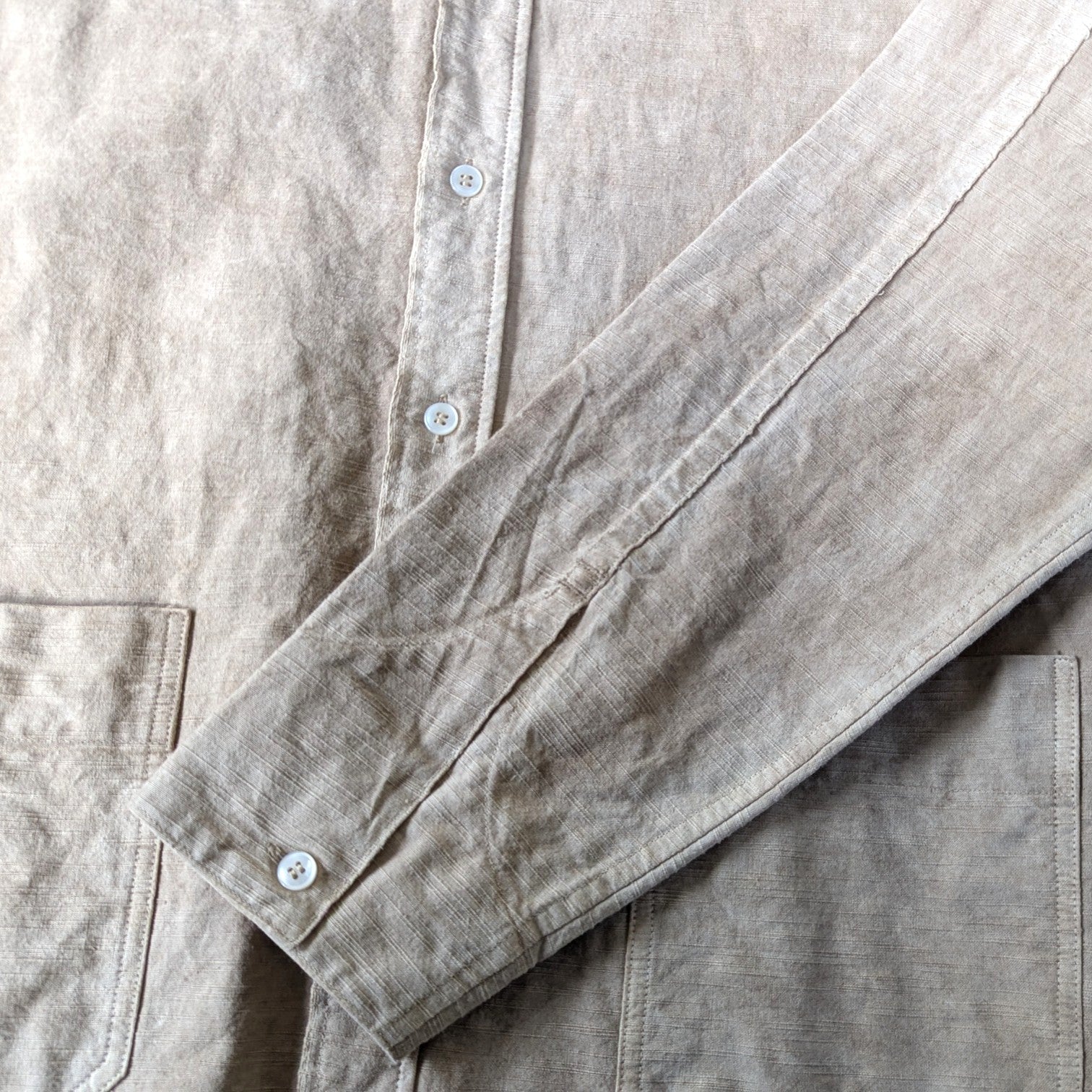 土染め&仕事着案件ということで色止めをしていることもあり、生地がやや硬めでラフな着心地。着ていくうちになじむように思いますが、いかんせん後にも先にも生産予定のないアイテムなので確かなことはわからないのが正直なところです。