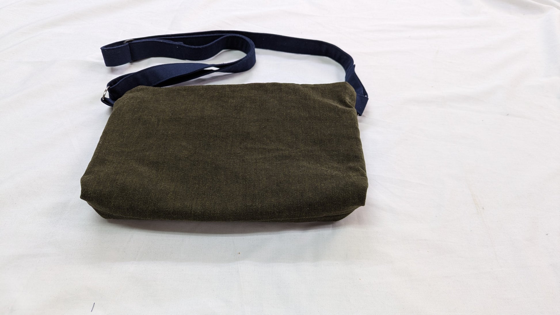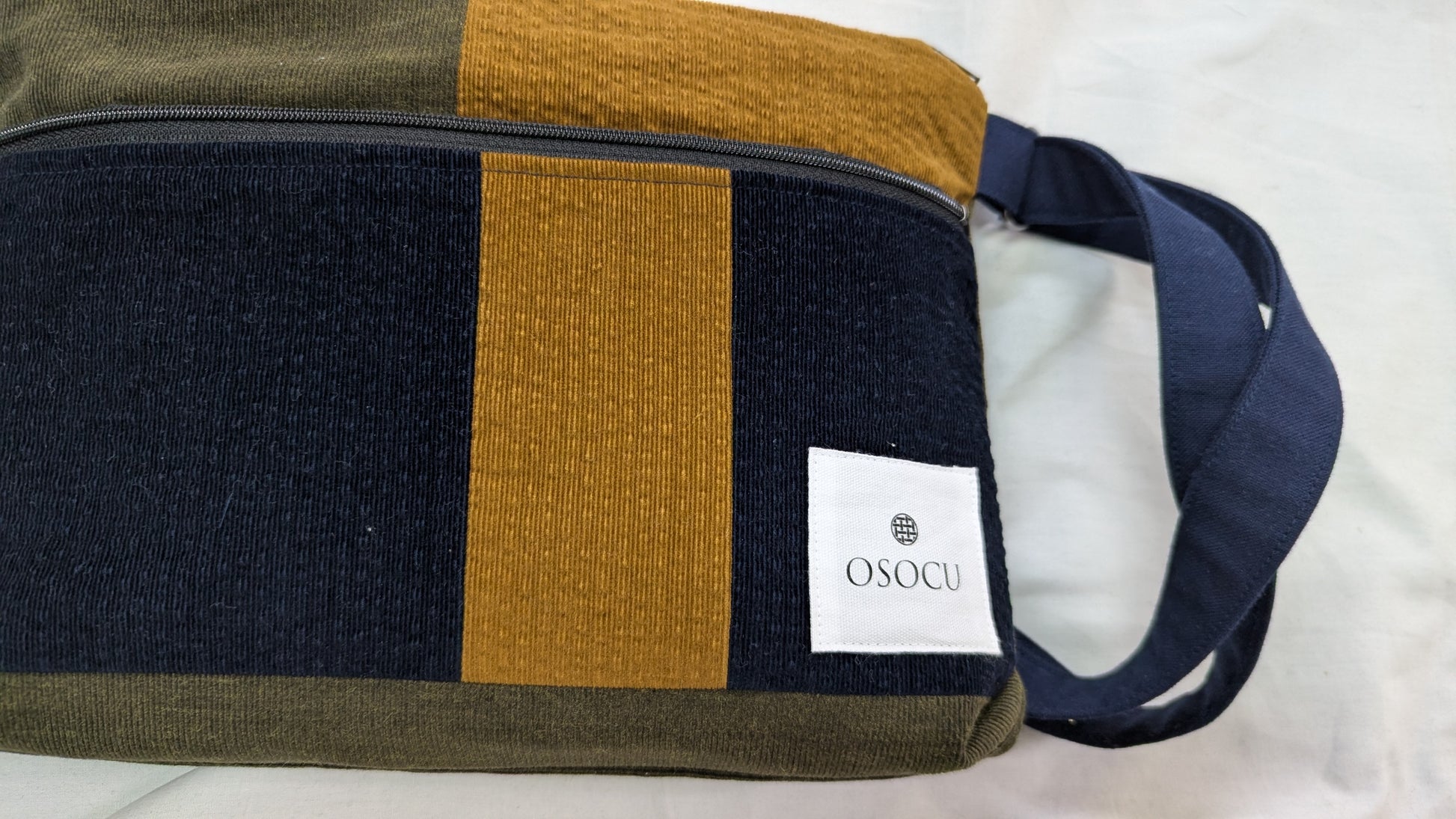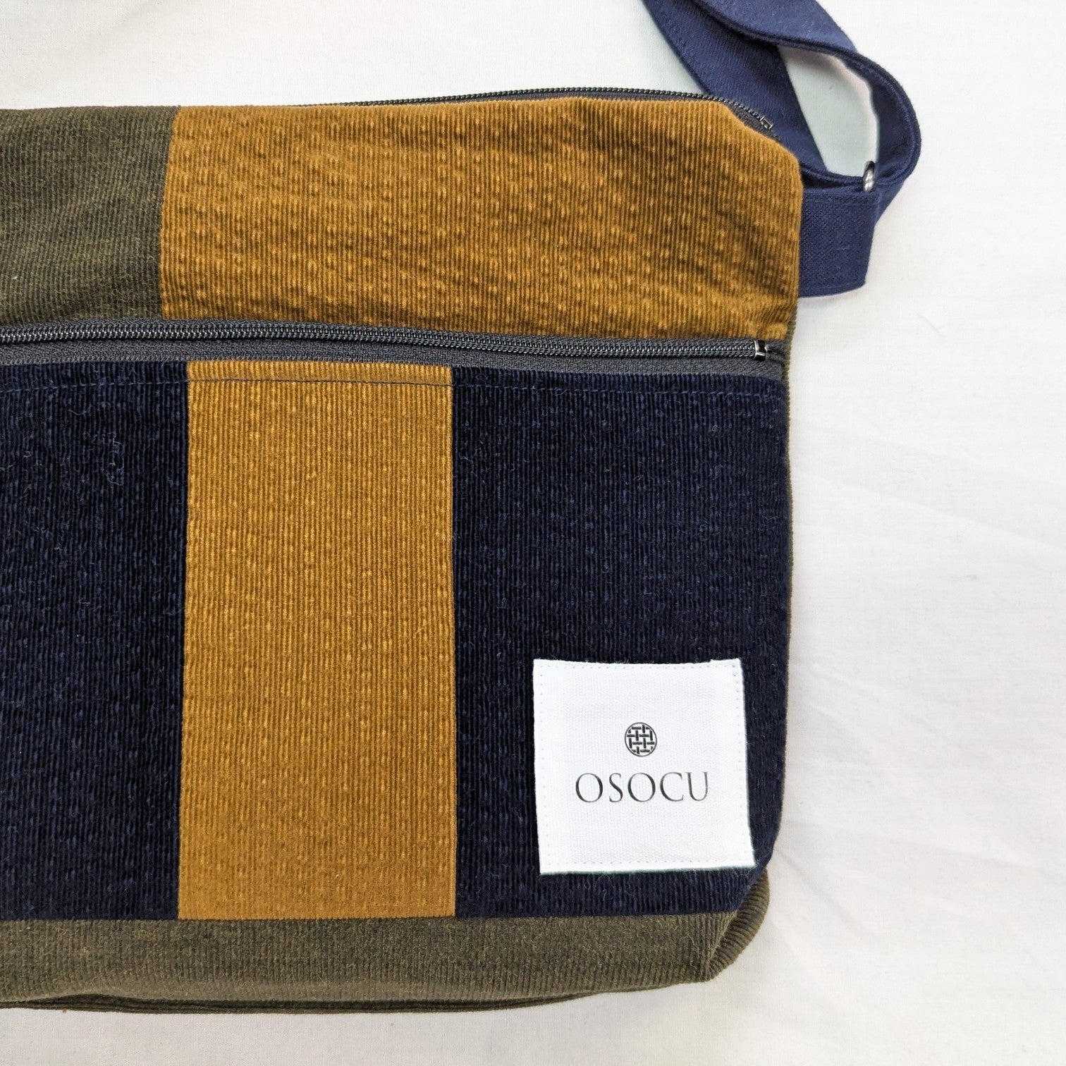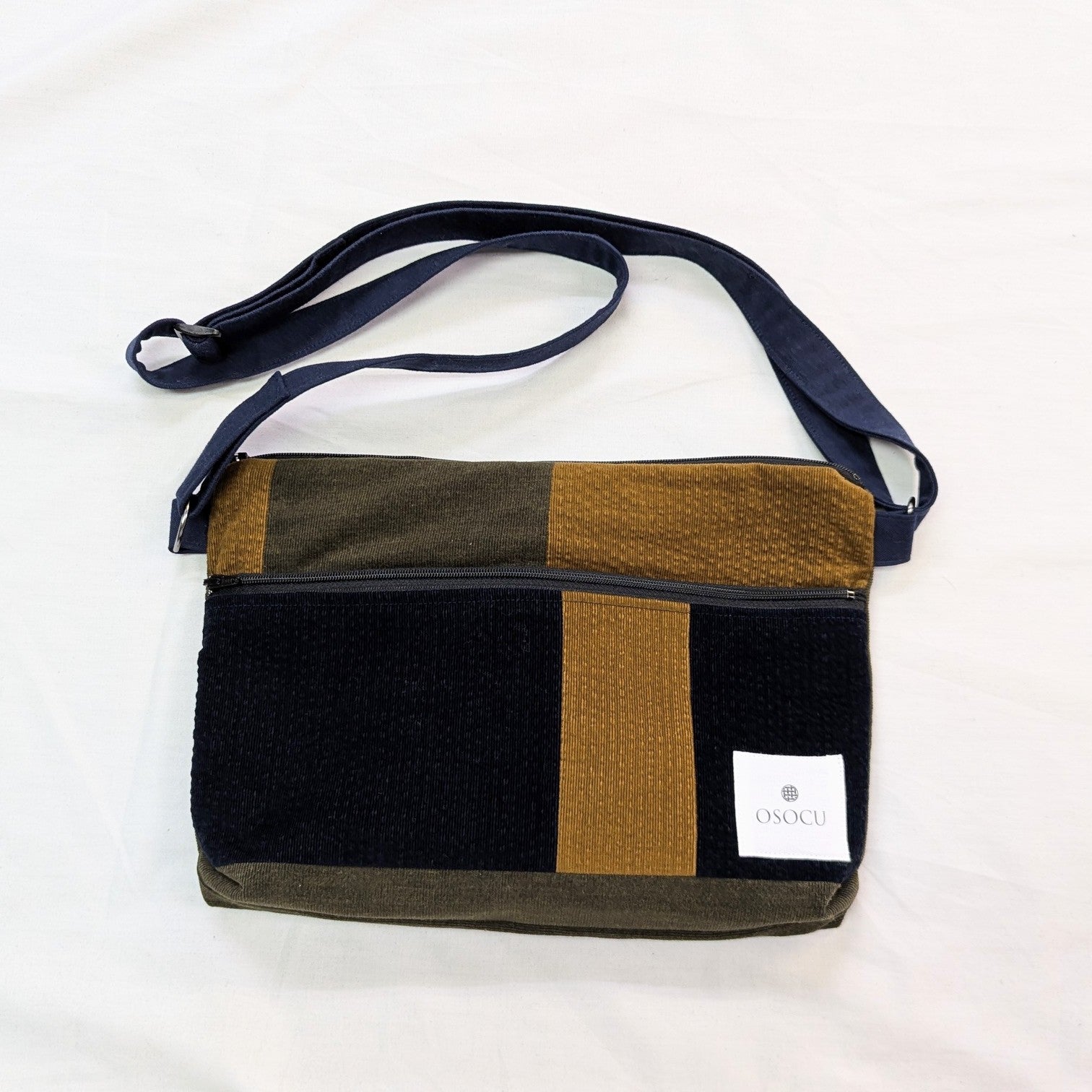 ネイビー、マスタード、カーキの3色を組み合わせたパッチワーク生地を使ったバッグ。