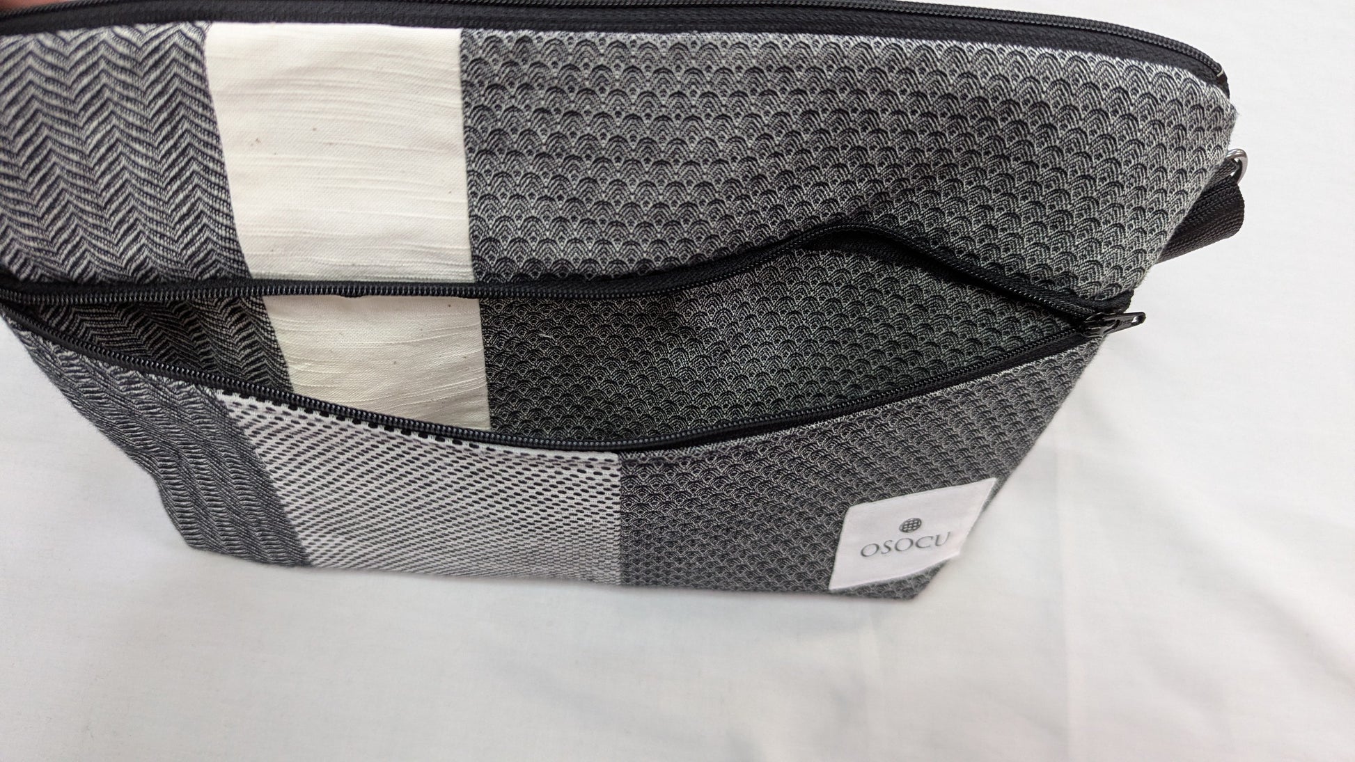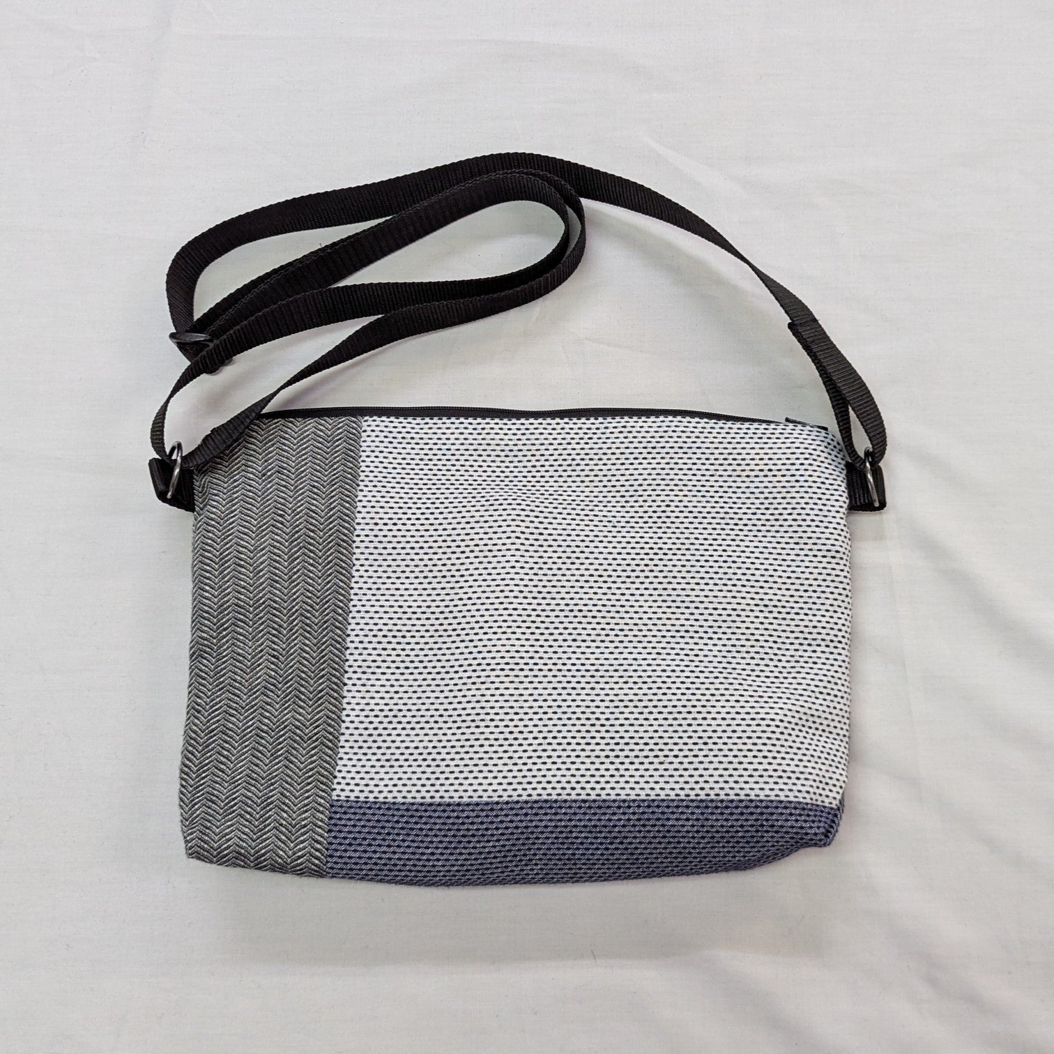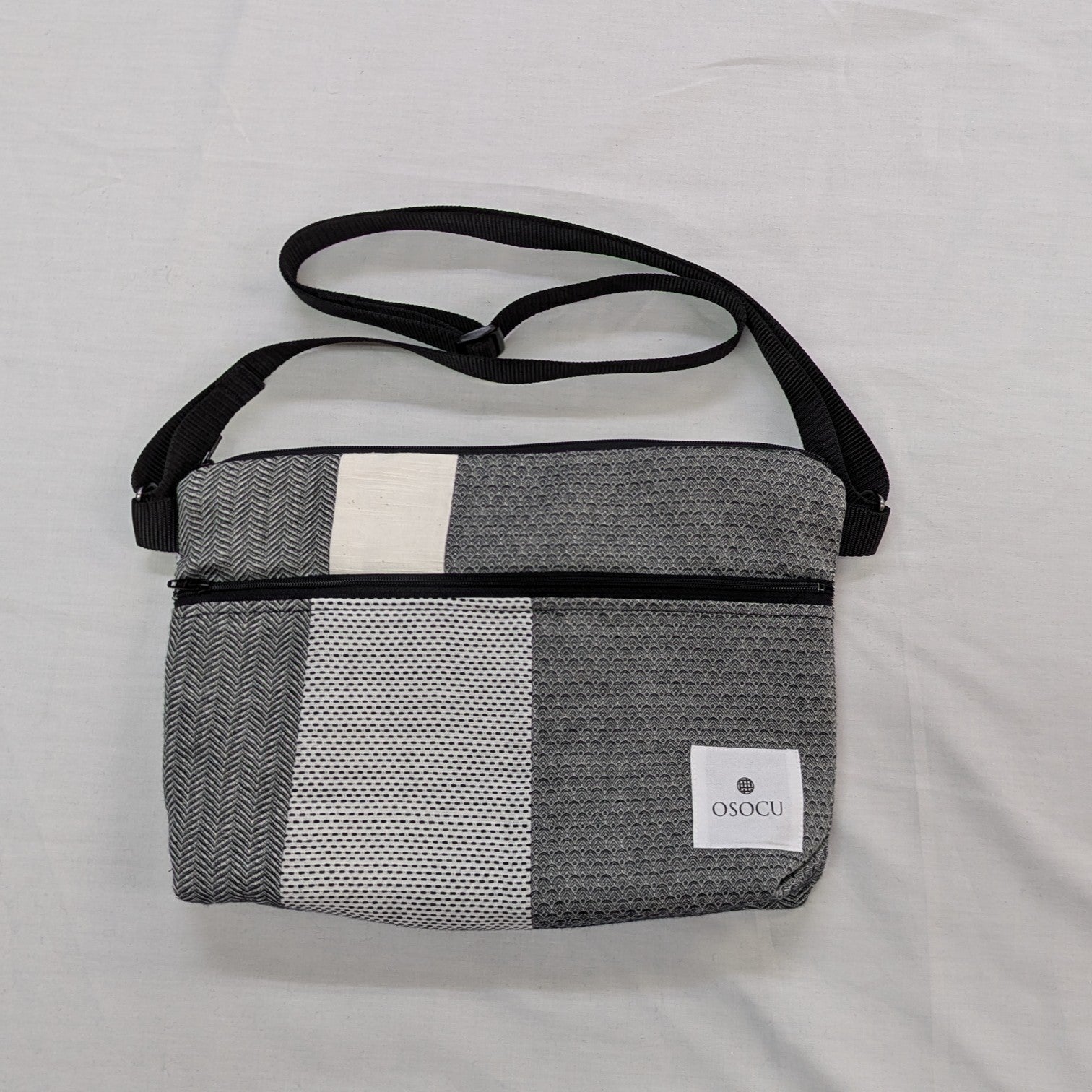 OSOCUの工房で捨てずに残している裁断ハギレを使い、縫製職人さんが自由に組み合わせ1点もののサコッシュです。