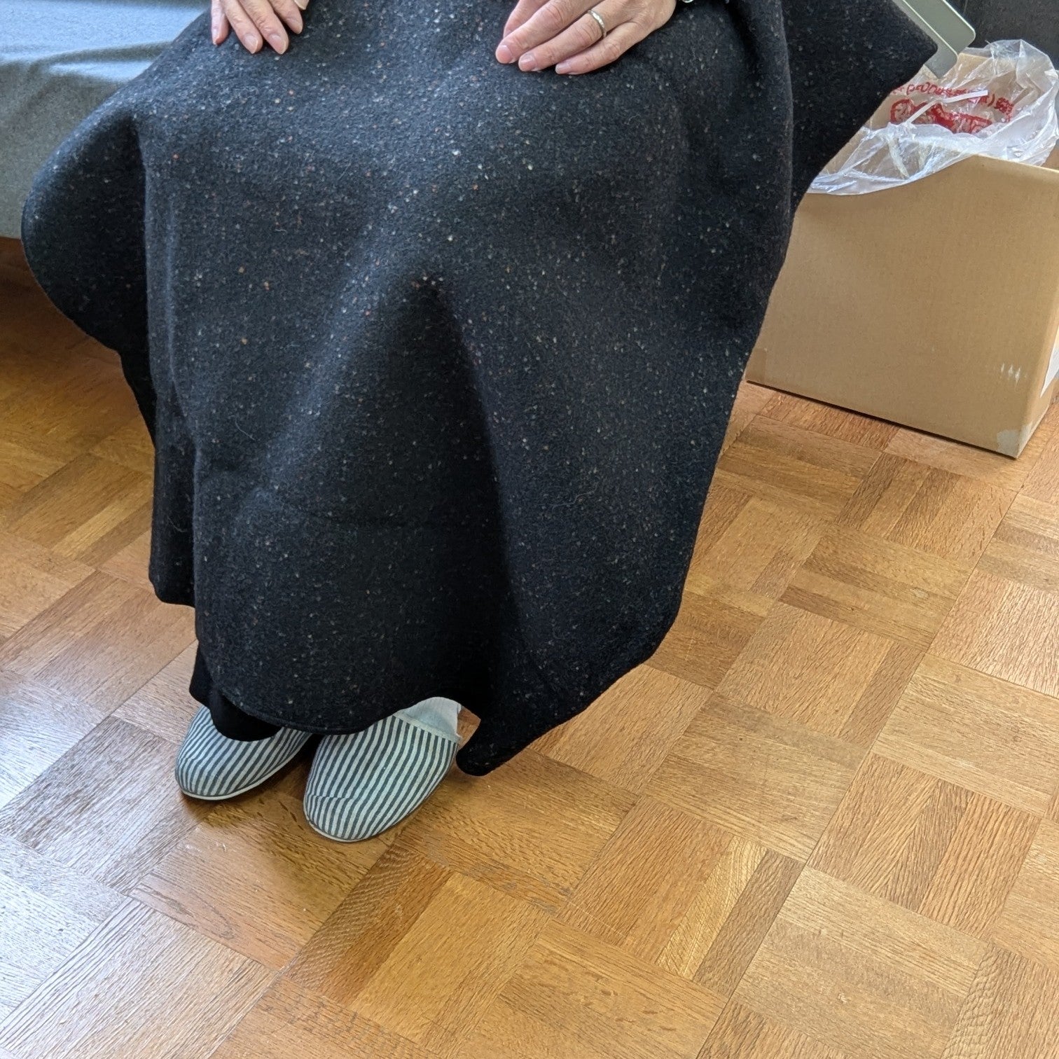 2枚の生地が合わさった構造で重量感もあったため、OSOCUでパンツにするプランを諦めました。その残布をほぼ使い切る形でブランケットに仕立てています。